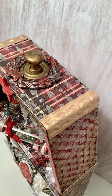 I started with an Idea-ology wooden box and covered the sides and top with Idea-ology Christmas papers that I had added a Mosaic stencil over top and then applied Distress Snowfall grit paste to the stencil. It gives a beautiful sparkly effect. Gold metallic die cut pieces were added to the corners and joints of the box.